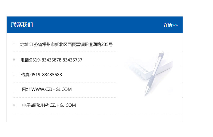 地址:常州市新北區友邦商務大廈1幢16、17層  電話:0519-85101652  傳真:0519-85112595  郵編:213022  網址:www.cz-jiayue_cn.chinaheks.com  郵箱:xiajifengaa@163.com